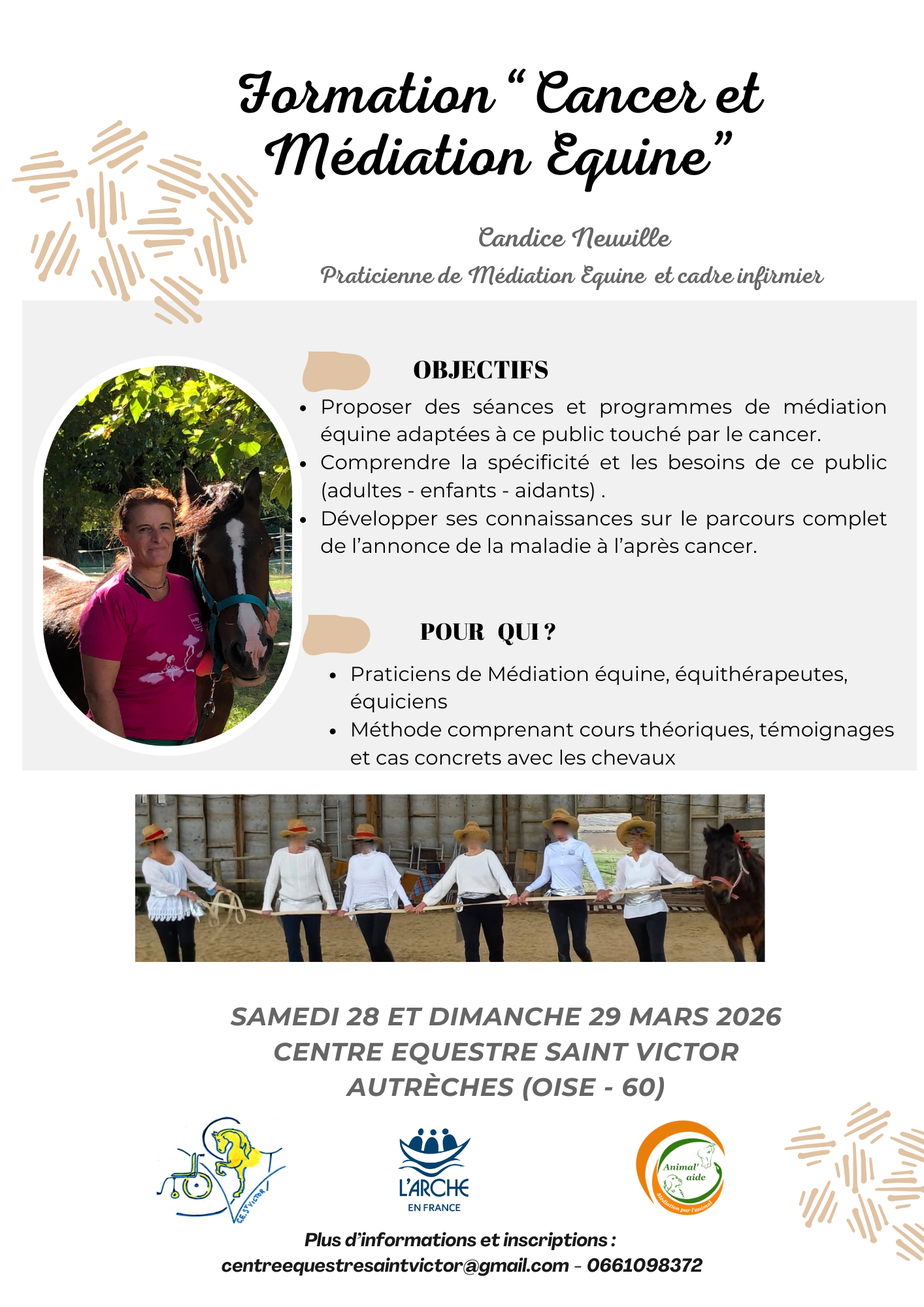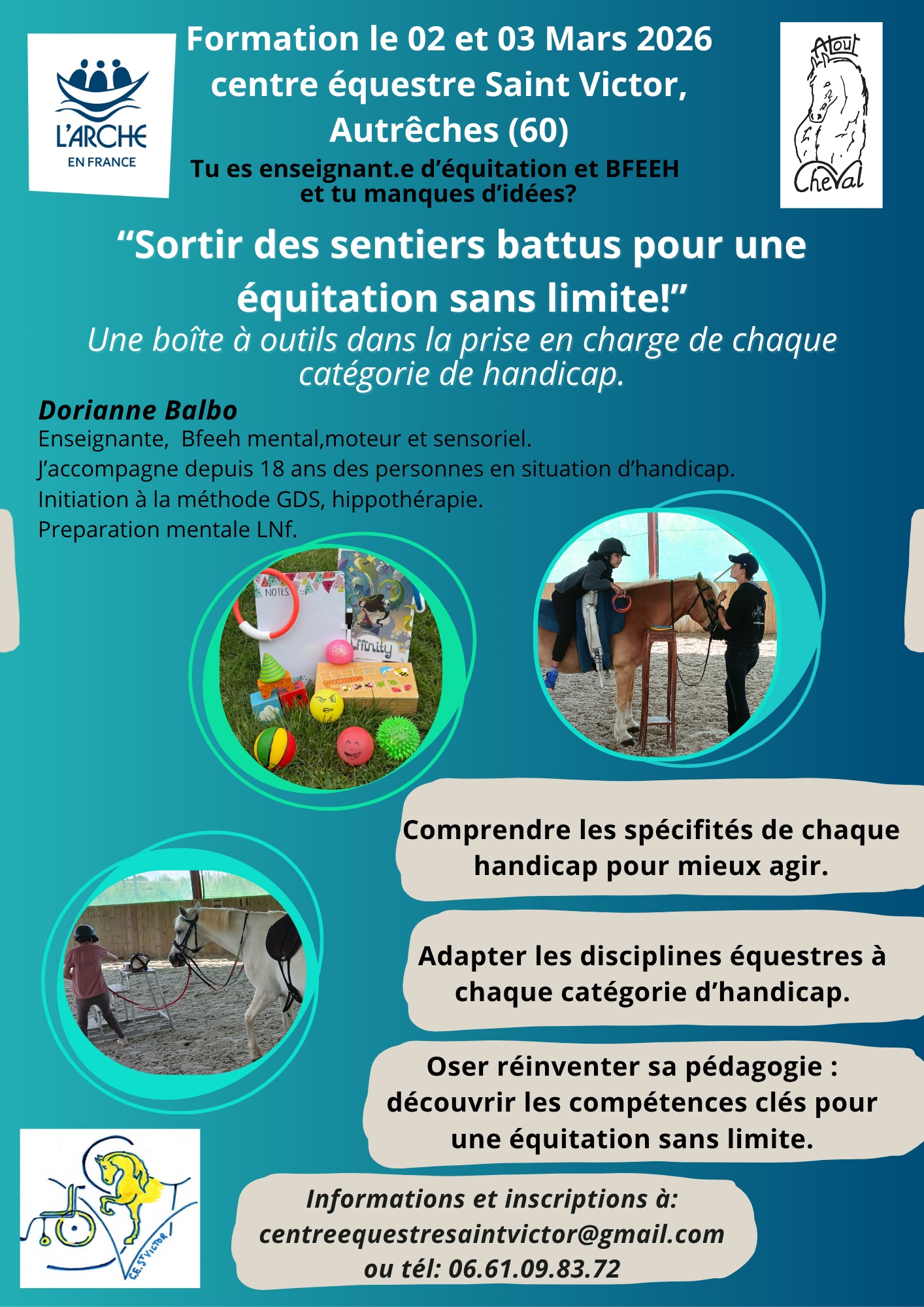 Vous êtes moniteur/trice d’équitation, vous accueillez des personnes en situation de handicap en équitation adaptée et vous souhaitez développer vos connaissances du handicap? Vous souhaitez découvrir ce qu’est l’équithérapie, la thérapie avec le cheval, la médiation équine?